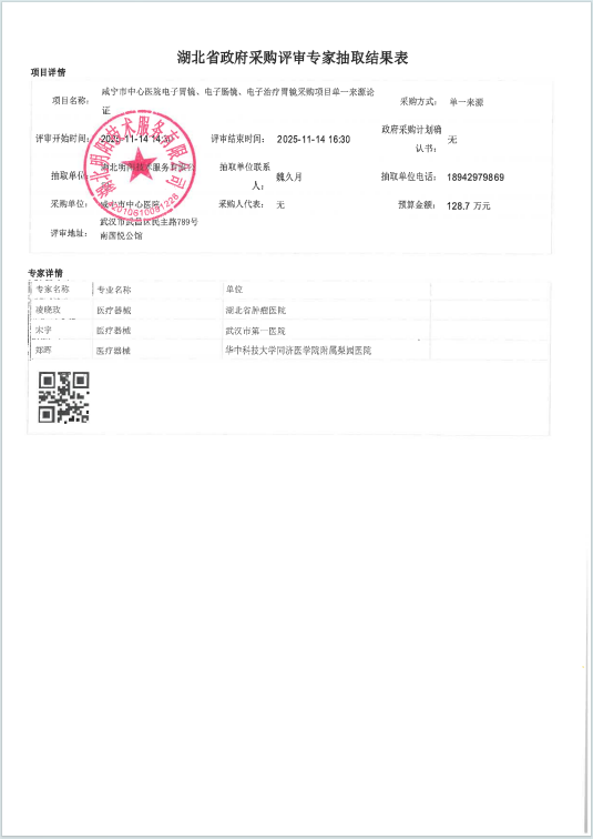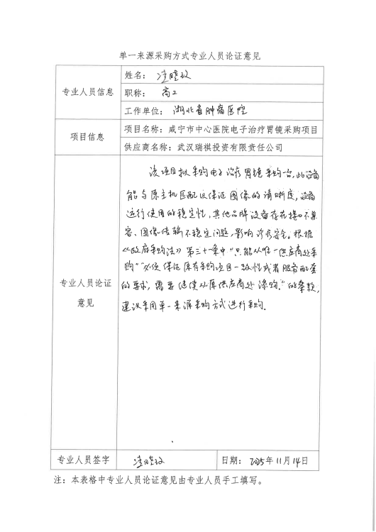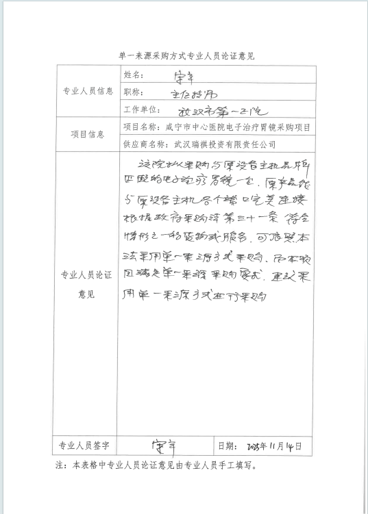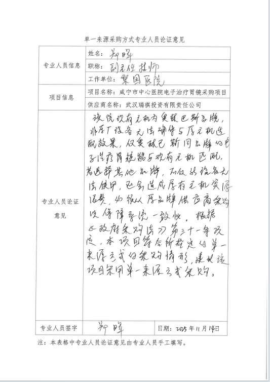 成宁市中心医院电子胃镜、电子肠境、电子治疗胃镜采购项目单一来源论证